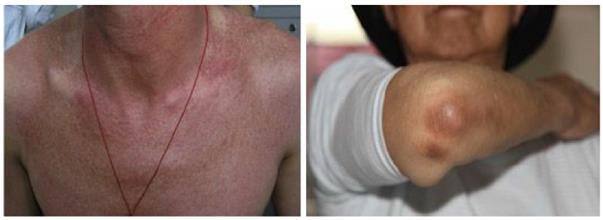 一些非小细胞肺癌尤其是肺腺癌的患者,可能在诊断前平均约2年内的时间里,在脸部、颈部、上胸、背部、双侧肘部、双手背侧的关节等部位出现对称性皮疹,皮疹的颜色大多为暗红色,一些病情进展迅速的偶尔也可呈猩红色,这些皮疹在给予外用激素类药物治疗后可以短暂褪去,但很快又会再次出现,出现皮疹的同时有时会伴有肌肉的酸痛。上述现象在临床上被称为“皮肌炎”,这是一种已被证实与内在恶性肿瘤密切相关的体表现象。