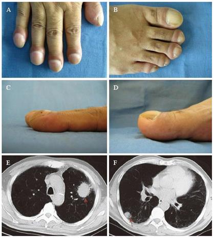 一些肺鳞癌患者,可能在诊断前平均约2年内的时间里,会出现手指或脚趾末端的肿胀、肥厚,或大关节如膝关节的肿痛,症状与类风湿关节炎相类似,而类风湿相关的检查指标却是阴性,在临床上被称为“肺性肥大性骨关节病”,病变在手指或脚趾末端时,被称为“杵状指(趾)”。