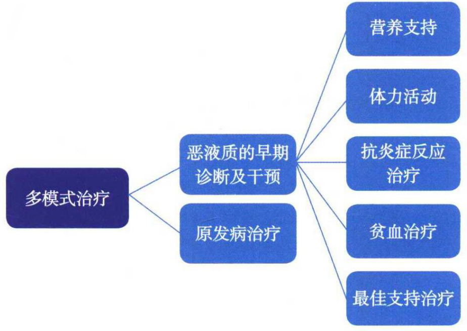 恶液质常见于慢性疾病特别是终末期恶性肿瘤患者,肿瘤恶液质的发生不仅影响到原发疾病的治疗效果,还会导致患者生活质量下降、预期寿命缩短。所以早期发现恶液质,及时干预尤为重要。临床治疗肿瘤恶液质的目标为纠正恶液质状态或稳定现状、保证患者一定的生活质量、缓解症状、尽可能延长预期生命。尽管至今没有单一的治疗措施或药物能够单独有效的治疗恶液质,但全面了解 病因并采取合适的治疗对于肿瘤恶液质患者仍然是有帮助的。产生肿瘤恶液质的原因有许多,包括食物摄入减少、激素水平缺乏、分解代谢亢进、长期卧床以及并存的疾病状态等。肿瘤恶液质是一种复杂的慢性疾病过程,主要是由于代谢、神经内分泌以及营养合成三方面功能异常共同作用导致的结果。肿瘤恶液质的治疗应包括患者家庭成员在内的多学科团队合作,并且随着患者机体状况及恶液质分期的变化,需要对其营养状态反复进行再评估,以及对治疗措施的不断更新等。