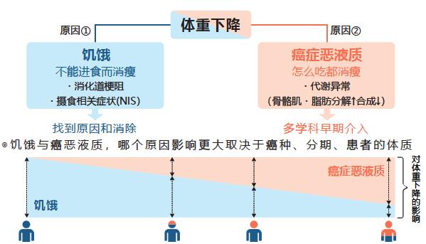 癌症患者的体重下降的主要原因是癌症恶液质和饥饿。