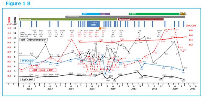 之后持续细胞疗法,从2017年开始每3个月细胞治疗1次,2018年6月开始每6个月细胞治疗1次。期间也接受过Trastuzumab + Pertuzumab、T-DM1等治疗,但抵消了很多副作用,一直保持ECOG=0状态。后10年的血细胞水平如下