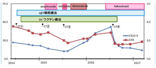 李阿姨确诊后拒绝了化疗和内分泌治疗,觉得太痛苦。之后尝试免疫细胞治疗。在2014年6月开始αβT细胞,之后追加DC疫苗治疗2年+,经IHC检查使用了人工抗原MUC1、HER2、WT1。期间断断续续使用过几次较短时间的内分泌药物。直到2016年8月发布该个案论文时,患者仍然生存。