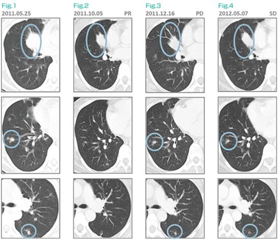 39岁女性,无吸烟史,2011年4月诊断EGFR阳性肺癌,胸椎转移,cT4N0M1b。6月开始口服厄洛替尼(特罗凯),10月CT检查略有缓解,但已发生病理性骨折,无法站立。11月开始在濑田接受αβT细胞(制备过程中洗除部分Treg)+厄洛替尼治疗,12月CT发现肿瘤进展,诊断厄洛替尼耐药。此时按照标准疗法应该停止厄洛替尼,改为化疗,但患者不同意。制剂继续接受厄洛替尼+细胞治疗,在2012年1月、2月、5月、6月的CT评估中,肿瘤保持稳定(SD)。