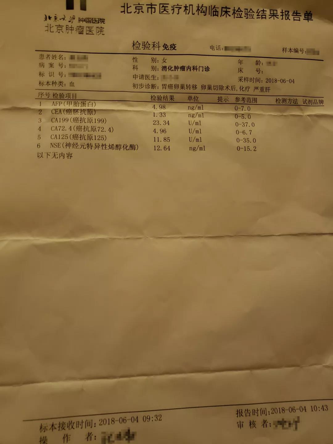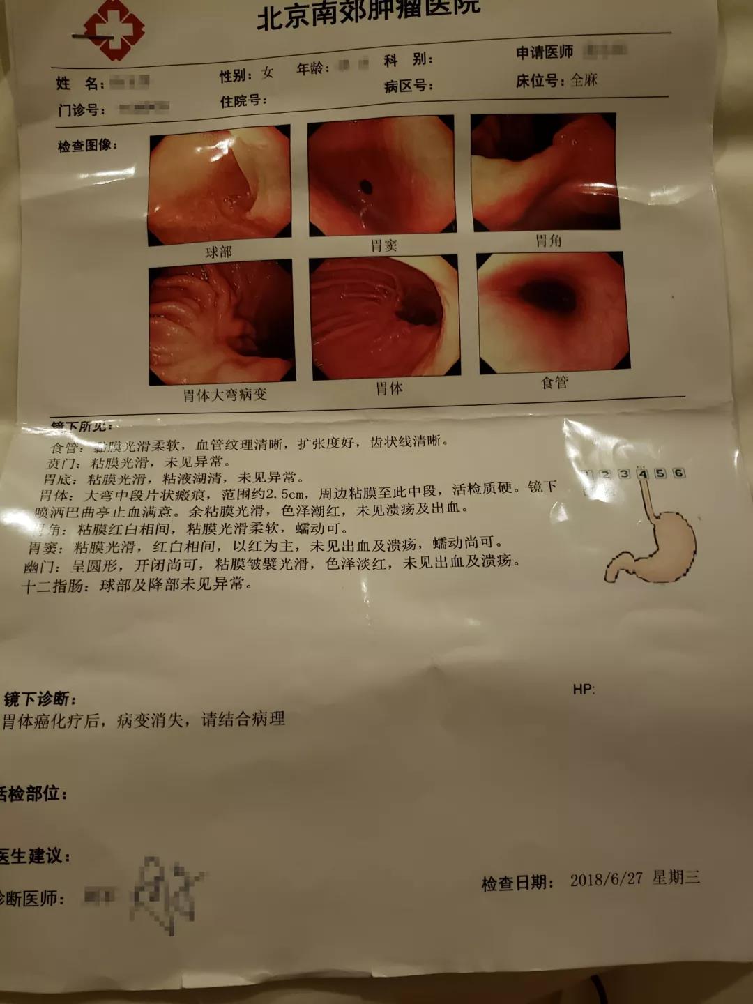 3个月前还维持不变呢,接着阿姐就用微信给我发来了最近的检查报告,6月4日的肿瘤标志物指标已经在正常,6月28日胃镜报告则显示“胃体癌化疗后,病变消失,请结合病理!”。