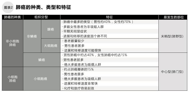 作为空气通道的气管、支气管、以及气体交换场所的肺泡细胞,在某种原因下可能发生癌变。从肺癌发生部位分,肺入口附近的主气管发生癌变的称为中心型(肺门型)肺癌,肺的深处发生癌变的称为末梢型(肺野型)肺癌;从组织分型上有“非小细胞肺癌”(腺癌、鳞癌、大细胞癌)和“小细胞肺癌”,其性质、发展、治疗方法和治疗效果各不同(图2)。肺癌中约85%为非小细胞肺癌,其中最多的是腺癌。