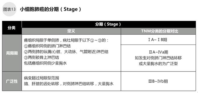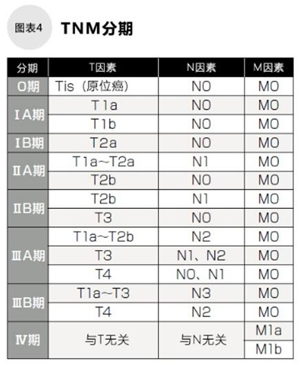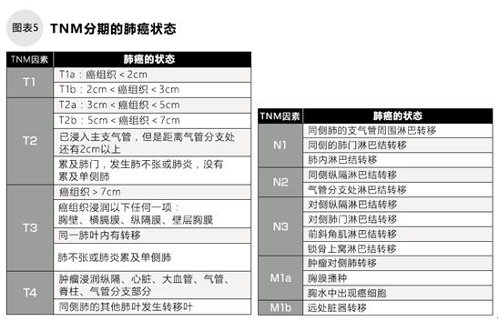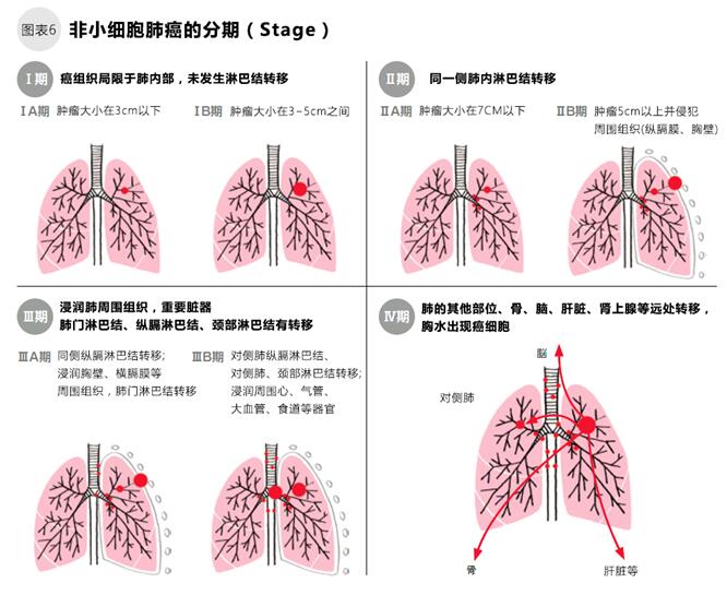 根据这三个因素可将肺癌细分为8个分期:0期、ⅠA期、ⅠB期、ⅡA期、ⅡB期、ⅢA期、ⅢB期、Ⅳ期(图4、5)。越接近0期癌组织越小范围越局限,约接近Ⅳ期癌组织越大,扩散程度越大(图6)。
