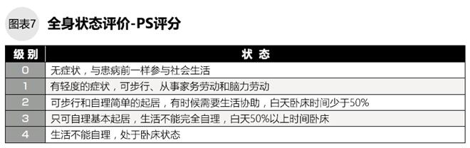 使用哪种方法治疗肺癌,必须综合考虑肿瘤的组织类型、病理分期、患者年龄、整体生理状态(PS评分 图7)、心・肝・肺・肾的脏器功能状况以及是否有其他疾病的既往史。一般情况下PS评分在0~2之间的可以考虑采用手术、放疗和化疗,身体状态不佳的只能采取副作用小的治疗,如taptap点点网页登录。