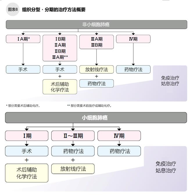 在现实中,首先根据放射线治疗和化学药物治疗的特性区别对待非小细胞肺癌和小细胞肺癌(图8)。非小细胞肺癌早期不易转移,药物治疗和放射线治疗不易见效,Ⅰ期、Ⅱ期的早期病例首选手术治疗;而小细胞肺癌早期易发生转移,药物治疗容易见效,除Ⅰ期外首选药物治疗(化疗)。