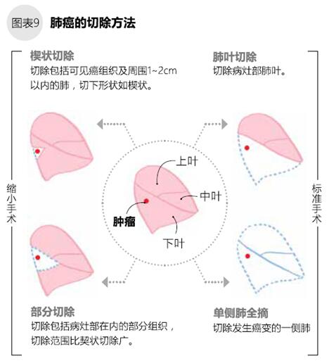 肺癌手术是在全身麻醉的情况下进行的。早期肺癌多用胸腔镜进行切除手术,而普通的开胸手术需要从后背切开7~15cm的皮肤,然后切开肋间肌,开胸切除病灶、肺叶和周围淋巴结(淋巴廓清术)等。人类有双肺,左肺2个肺叶,右肺3个肺叶,开胸手术时视病状切除1个肺叶或者整侧肺(标准手术 图9)。 但是根据患者的身体状态和术后影响呼吸的评估,可行缩小手术。