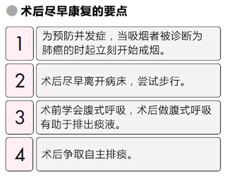 肺癌术后,为了排出肺内滞留的血液、体液和空气,需要在胸腔内插入引流管2~4日。如果术后无特别异常,第二天患者就不用专门吸氧了,可以开始尝试进食和步行,2周后出院。有些术后行辅助化疗,可以提高治愈率。术后尽早尝试活动身体、下床、步行、腹式呼吸,有助于减少术后并发症,康复速度更快。