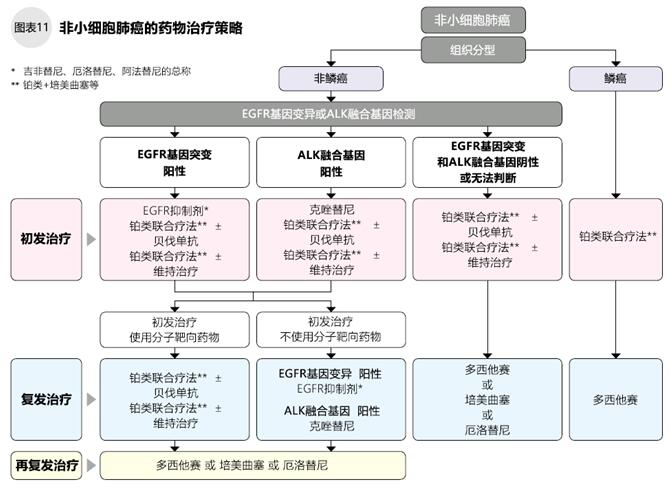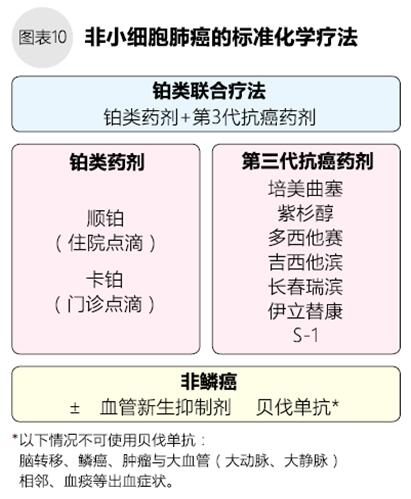 癌症的药物疗法包括细胞毒性抗癌剂和分子靶向药物治疗,结合手术和放疗、免疫治疗可能预防癌症的复发转移。非小细胞肺癌的药物治疗有使用细胞毒性抗癌剂阻止癌细胞增殖、破坏癌细胞的化学疗法,以及将肿瘤增殖的相关物质作为靶点的分子靶向药物治疗。使用铂类制剂(顺铂、卡铂、奈达铂等)和第3代抗癌剂(培美曲塞、紫杉醇、多西他赛)的联用是标准的化疗方案,根据病患的整个身体状态,在标准化疗方案基础上增加贝伐单抗也是较普遍的药物治疗方法(图10)。