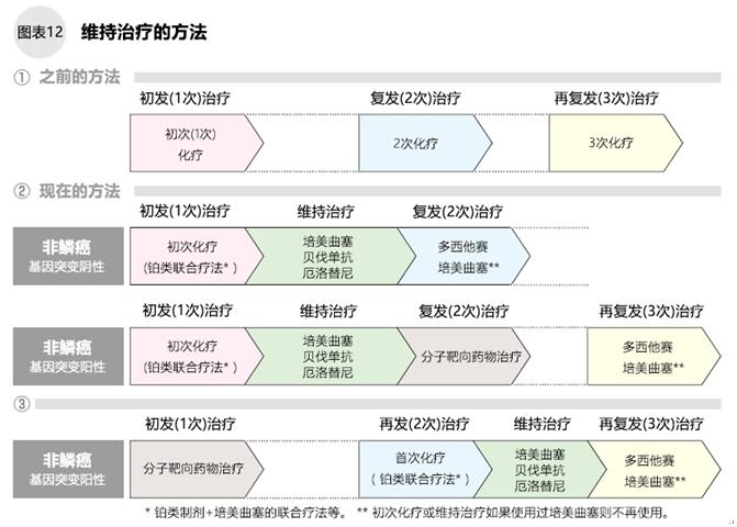 过去,对于非小细胞肺癌的首次化疗,在4~6次的化疗后就不再进行治疗了,之后随访观察直到发现复发转移后再开始治疗。但是现在,经首次化疗控制住肿瘤的,首次化疗的疗程结束后就就开始维持治疗(图12)。进而,非小细胞肺癌中,非鳞癌且基因突变阳性的患者,初期已经使用了分子靶向药物,复发后开始使用抗癌剂,之后可一致使用低剂量抗癌剂维持治疗。