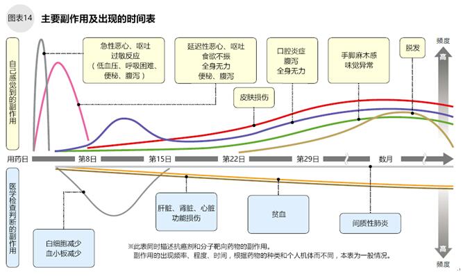 药物治疗的副作用因人而异,有的患者在使用抗癌剂的当天就开始出现过敏反应,脱发、恶心呕吐、食欲不振、腹泻、口腔炎症、白血球、血小板减少等症状。化疗之前和化疗同时使用一些减缓副作用的药物可能减轻症状,如果副作用过于强烈,就需要减少抗癌剂用量或者中止化疗。要在更好的状态下延长生存期,按计划完成化疗很重要,但是没必要忍受强烈的副作用,请与医师及护士随时沟通,必要时进行姑息治疗。