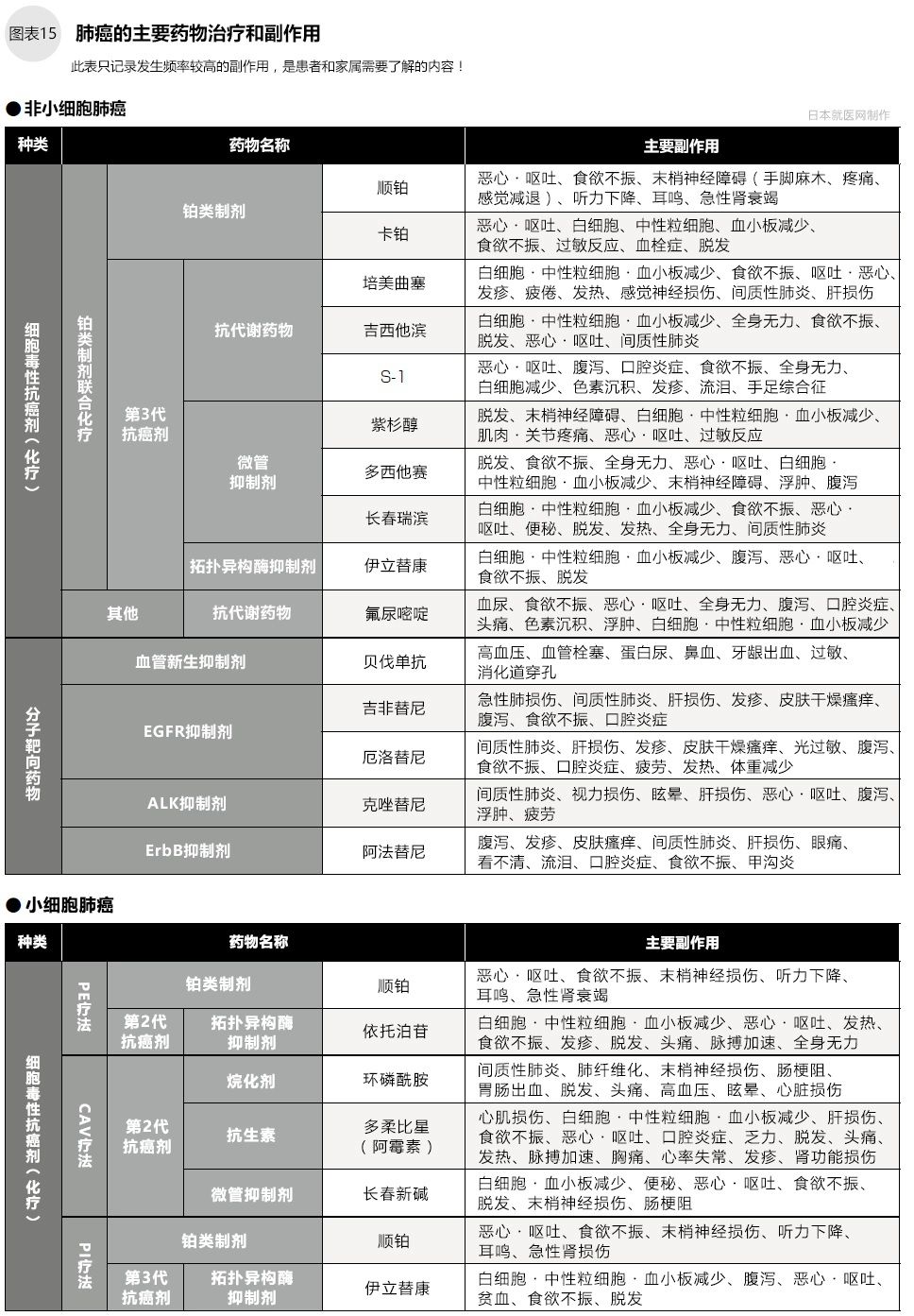 无论非小细胞肺癌还是小细胞肺癌,常用抗癌剂的副作用主要有白细胞、中性粒细胞、血小板、血红蛋白减少等骨髓抑制症状。骨髓抑制一般出现在开始化疗后1~2周,没有自觉症状,可通过血液检查诊断。紫杉醇、多西他赛有伤害神经的副作用,易引起手脚麻木、疼痛等感觉;S-1(替吉奥)、替加氟脲嘧啶易引起腿脚疼痛、肿胀、浮水等,需注意手足综合征。手足综合征多出现于用药后1~2个月。多数抗癌剂易引起恶心、呕吐的症状,可处方止吐药缓解,不必过分担心。