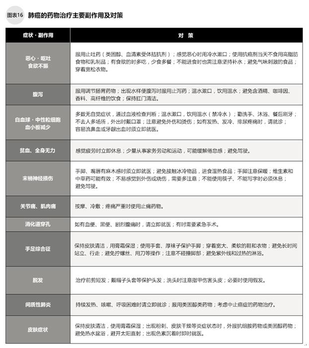 治疗肺癌的药物种类非常多,其副作用的种类、程度和时期不尽相同,副作用的出现方式也因人而异。患者需要在接受治疗前了解其药物的主要副作用,开始治疗后尽量不中断,完成该治疗。