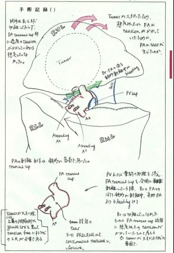 肺部的血管受到微小的损伤就会产生大出血。极其突然的事态,使我大脑一片空白,那一瞬间呆滞在了手术台前。数十年后的今天,那次手术的场面依然深深地刻在我的脑海里。(那位患者虽然大出血,但得以及时控制并手术成功)手术结束后,我首先就拿笔将手术记录描绘下来。我没有跳过这次的出血事故,因为需要记录出血原因,对策以及自己的想法,作为今后的反省。