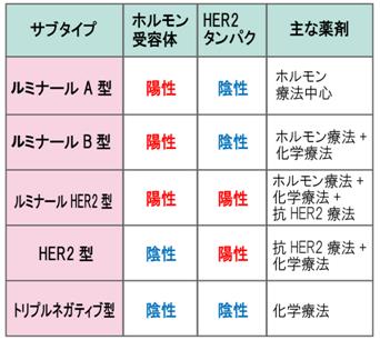 然而,近年来重要的是称为“ 亚型 ”的分类。乳腺癌亚型主要分为5种,取决于激素受体的阳性/阴性,称为HER2的蛋白质阳性/阴性。通过这种分类,我们将决定化疗(抗癌药物治疗),HER2治疗(分子靶向治疗)和激素治疗等手段与手术一起进行。