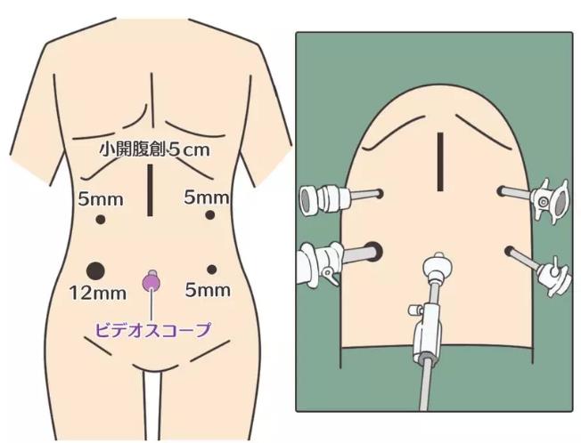 在许多医院通常进行的腹腔镜手术是在腹部打开五个孔的方法。在左右侧翼钻两个孔,插入镊子,从肚脐的孔中插入腹腔镜。然后用二氧化碳气体给胃充气,这样就可以俯视胃部进行手术。