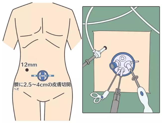 将肚脐块打开2.5到4厘米,然后在那里安装一个带有多个孔的设备,称为多接入端口。从孔中插入腹腔镜或镊子并进行手术。我们还在腹部右侧做了一个切口,大约12毫米,用于插入和操作镊子和切割装置。与通过打开5个孔进行的腹腔镜手术相比,它是一种更好的减少疤痕的方法。