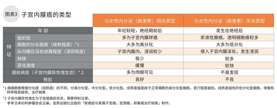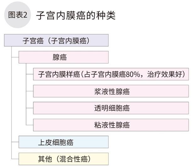 子宫癌有很多种类(图2)。约80%以上为发生于腺细胞(分泌润滑子宫内膜的粘液)的子宫内膜腺癌。根据是否与雌激素的分泌相关,可分多种种类(图3)。