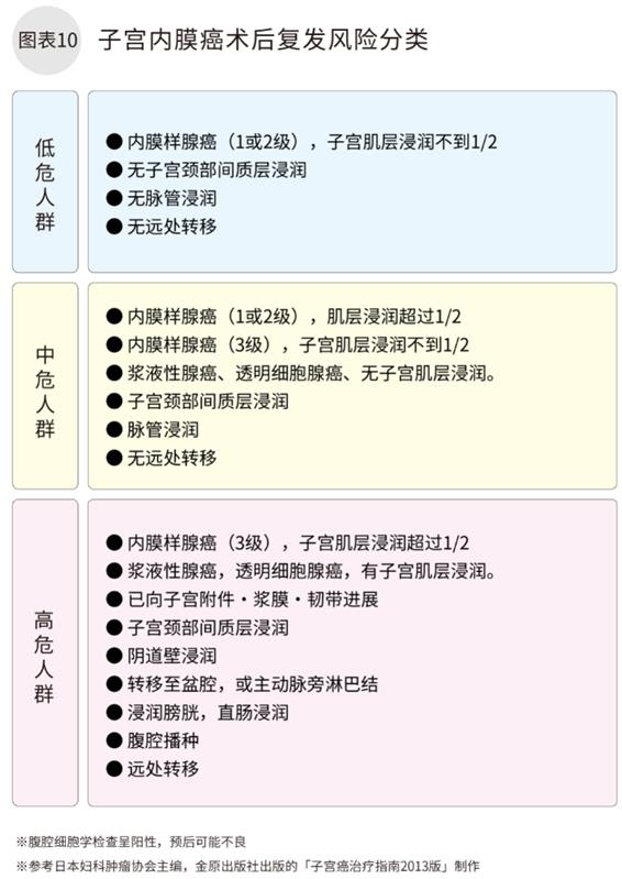 手术后根据《术后病理分期》标准再次进行诊断,确定分期。根据癌细胞的扩散情况,腹腔细胞学检查结果,以及淋巴结是否有转移等再次进行复发风险的评估后确定治疗方案。Ia期的低复发群体无需治疗,随诊观察即可。Ib期及以上中高复发人群,手术后应进行放疗或化疗。