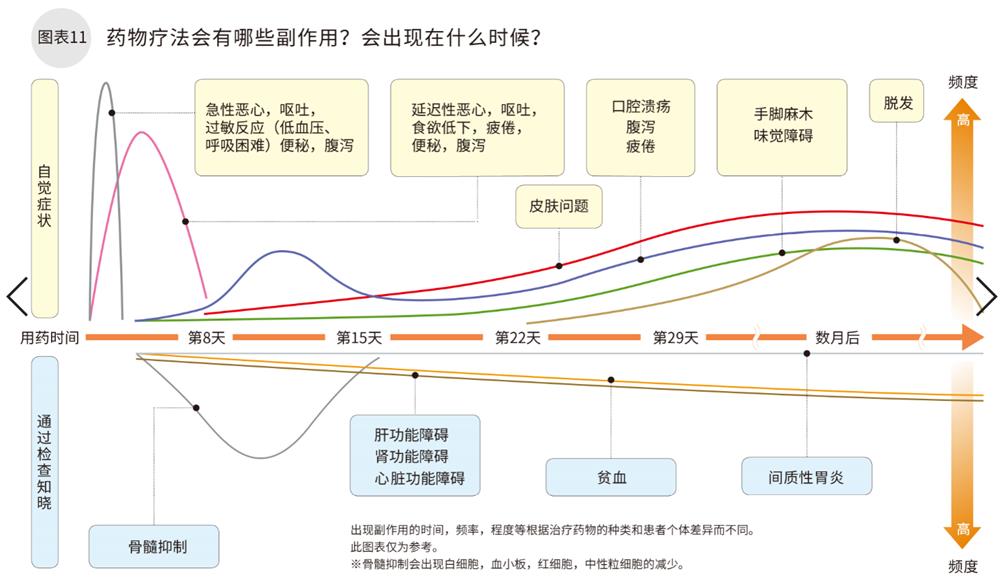 化疗药物虽然看上去差不多,但是药物的种类不同副作用也不同,个体差异很大。除了自己能感受到的,还有必须通过检查才知道的副作用。有些化疗药物用了马上就会出现副作用,而有些则会出现在数月以后。