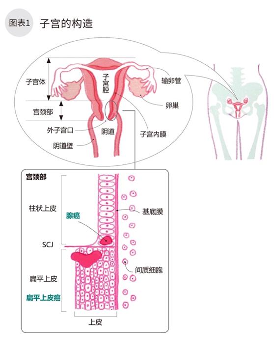 宫颈部,由表面上皮细胞(扁平上皮细胞,腺细胞)和内侧的基质细胞构成,中间由基底膜隔开。宫颈癌病变发生在上皮细胞中,暂时停留在上皮内。但会随着破坏基底膜而逐渐侵袭间质层(浸润癌)(图表1,3)。肿瘤逐渐增大,穿过宫颈部,向阴道壁,子宫附件,盆腔壁,膀胱,直肠等进展,继而向肺等远处器官转移(图表6)。