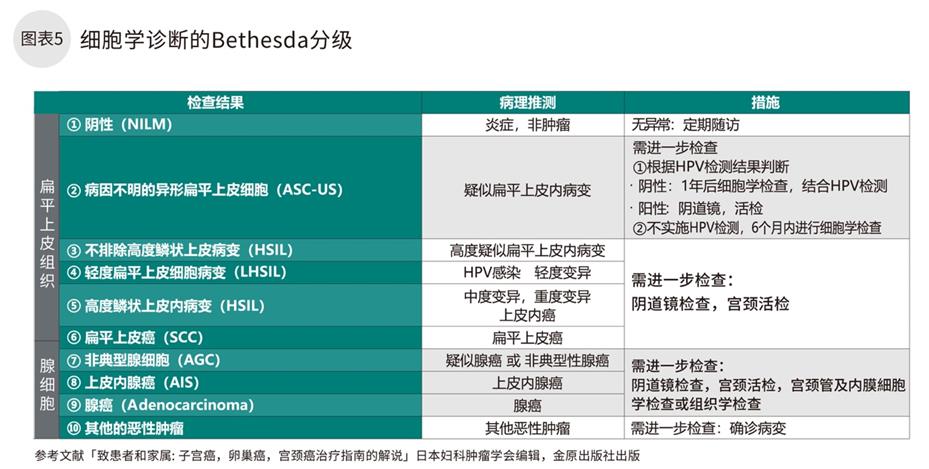 宫颈癌筛查中,用棉签或小刷子刮取宫颈部细胞进行细胞学诊断。如果疑似宫颈癌,将继续进行精密检查(图表4)。细胞学诊断依据Bethesda分级系统(图表5)。30岁以上需要细胞学诊断与HPV检测结合。30岁以下的,虽然HPV阳性几率较大,但一般可自行恢复,细胞学诊断有异常时再实施HPV检测即可。