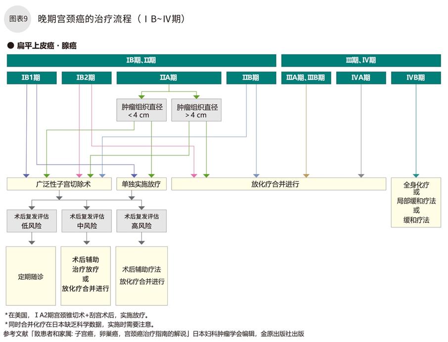 癌细胞浸润至宫颈部基质的ⅠB期,扩散超过宫颈部但尚未到达阴道下1/3,或尚未到达盆腔壁的Ⅱ期,实施广泛性子宫全切术,将子宫及周边的组织,卵巢,阴道的一部分,以及淋巴结等一并摘除。术后复发风险较大或无法手术的,可实施放疗,或放化疗联合。Ⅲ期(癌细胞浸润至阴道下1/3和盆腔)一般不予以手术,实施放化疗联合或单独放疗。发生远处转移的Ⅳ期,原则上实施药物疗法(图表9)。