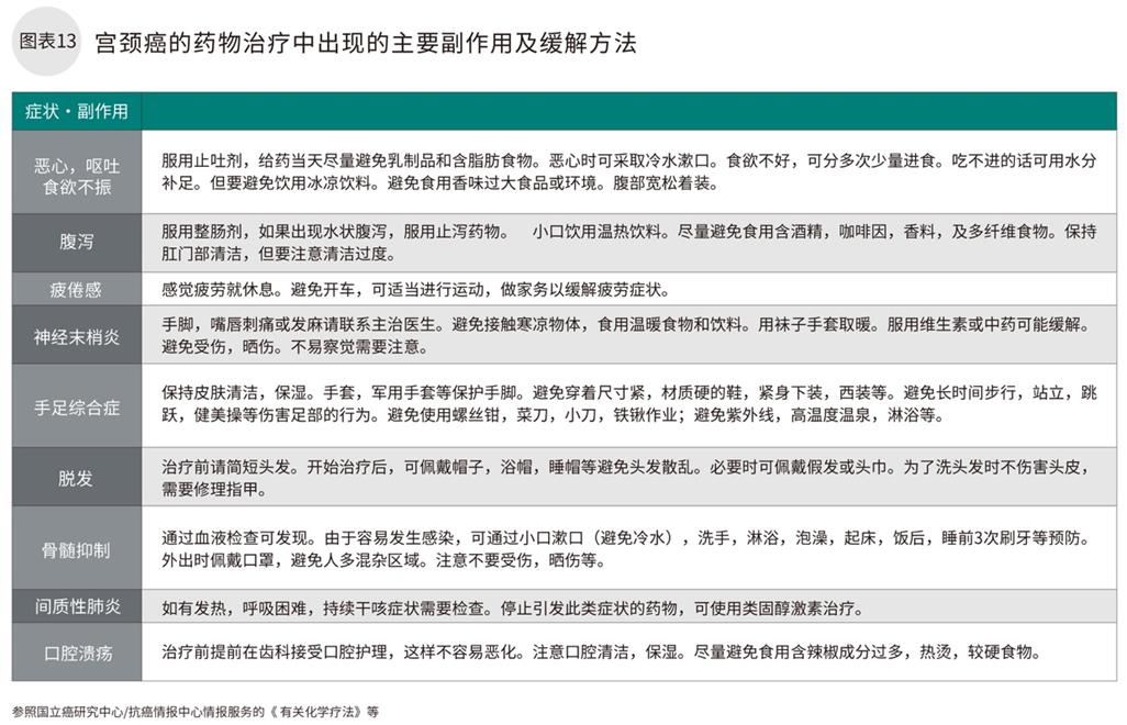 自觉症状中最有代表性的就是恶心和呕吐。通常提前服用止吐剂来控制。如果有手脚麻木,疼痛,浮肿等神经末梢炎症状以及手足综合症,则需要尽早治疗。图表13中将各种症状的缓解方法罗列出来了。不管发生什么副作用,提前知晓一般都可以缓解。尽可能避免中断或终止治疗。
