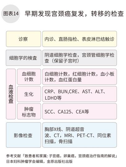 宫颈癌的复发约80%~90%发生在治疗后的5年内,5年后也有可能复发。大多数为盆腔内复发,而淋巴结,肺,肝脏,骨等远处转移也容易发生。因此治疗后前3年内每1~3个月,第4~5年每6个月,第6年开始每年1次需要进行定期随访检查(图表14)。