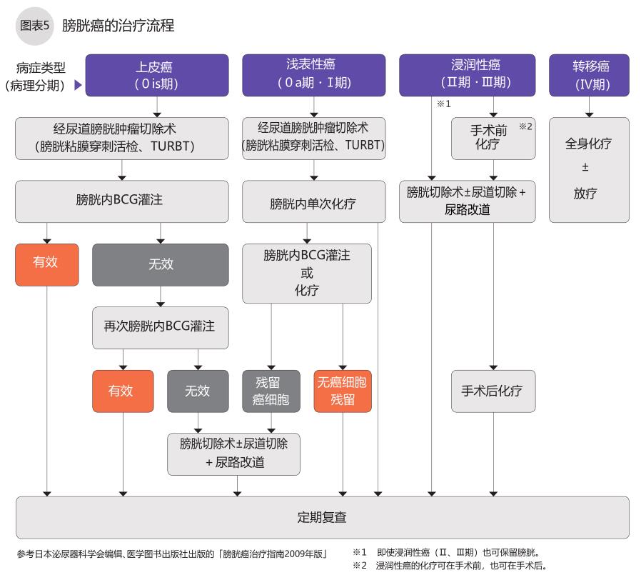 治疗流程按请参照图表5。浅表性癌或上皮癌,首先通过内视镜治疗(叫做经尿路膀胱肿癌切除术,兼活检),将病灶切除,之后为预防复发实施药物疗法。药物疗法的药物种类和治疗频度,根据肿瘤的类型,恶性程度,及数量大小等各不相同。