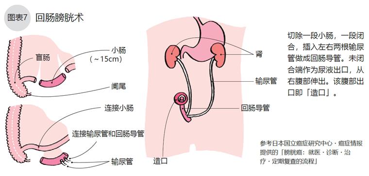 采集一段回肠,连接左右两根输尿管做为导管,尿液通过导管从腹壁(通常在右下腹)皮肤导出的方法,这个出口就是「造口」。回肠膀胱术(图表7)的优点:操作简单,用时短,并发症少。但是必须留置造口和造口袋而造成生活不便。而且造口周边皮肤容易出现皮疹,需要注重造口护理,及时清理以保持清洁。