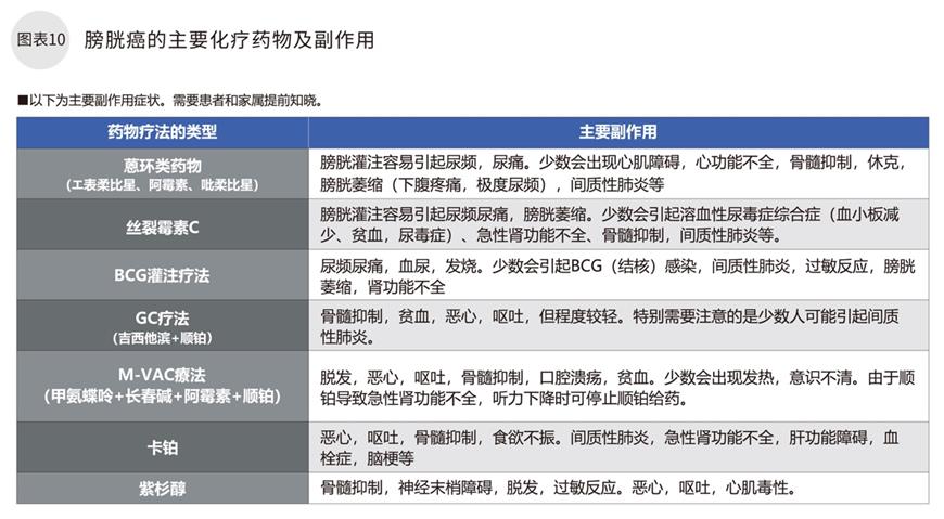 BCG灌注疗法和膀胱内化疗的主要副作用有膀胱炎,尿频,尿痛等排尿障碍,尿血。通过调整给药间隔,缩短给药时间可以得到缓解。TURBT后蒽环类药物给药频率低,但是需要注意可能引起心肌障碍,心功能不全,间质性肺炎。丝裂霉素则可能引起贫血,血小板减少,溶血性尿毒症,急性肾衰竭,骨髓抑制等。GC方案和M-VAC方案的主要副作用为恶心,呕吐,贫血,骨髓抑制。相比M-VAC方案,GC方案引发的恶心,呕吐,口腔溃疡,脱发的出现频率较低,出现严重副作用的可能性较低。M-VAC方案容易出现意识障碍,GC方案则需要注意可能出现间质性肺炎。