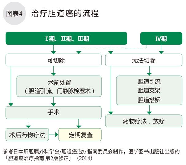 胆道癌Ⅳ期时由于发生转移,手术可能无法从转移的淋巴或器官中剥离肿瘤,此时的标准治疗为药物疗法。出现黄疸的,必须实施胆道引流(图表4)。
