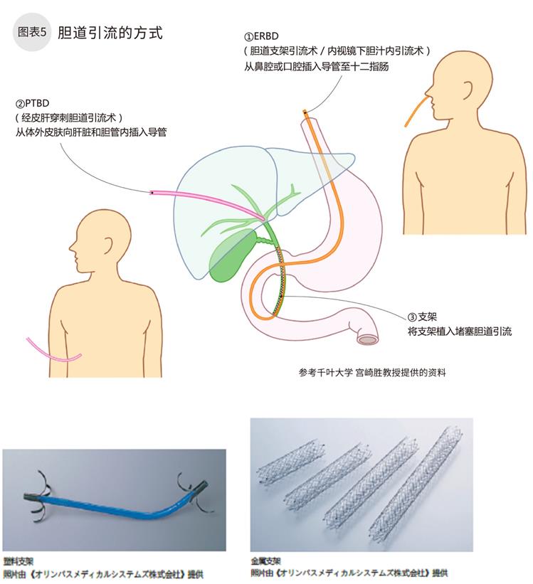 外瘘法,从鼻腔或腹部导出导管,用专用袋子或塑料管储存胆汁的方式。内瘘法,在阻塞的胆管中植入支架开辟新通道,恢复胆汁正常流动。支架有直径4mm的塑料支架和直径10mm的金属支架。塑料支架可以取出,价格也低廉。但容易发生堵塞或脱落,不能长期使用。