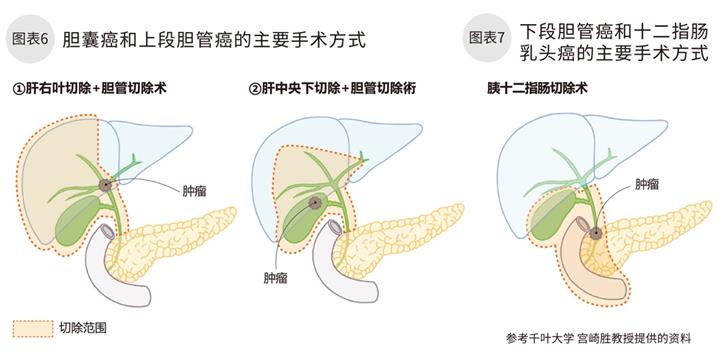 当肿瘤发生在胆囊,或上段胆管时,手术需要将胆囊和胆管,以及周围的淋巴结、部分肝脏一并切除。如果肿瘤在肝脏偏右的位置,就切除肝右叶(图表6①肝右叶切除术);偏左就切除肝左叶。如果肿瘤只局限在肝门入口,或者由于肝功能不好而无法切除部分肝脏时,可切除肝中央及以下部位(图表6②);胆囊癌可以只切除肝脏底部部分。