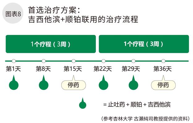 吉西他滨和顺铂联用的标准治疗方案:第1天和第8天给药,第15天停药,每3周一个疗程(图表8)。疗效和副作用根据每个患者的身体情况不同。英国和日本的临床试验数据显示:该方案最高可实施8个疗程。期待可以缩小肿瘤,延缓进展。CT影像显示肿瘤消失的,可实施手术治疗。