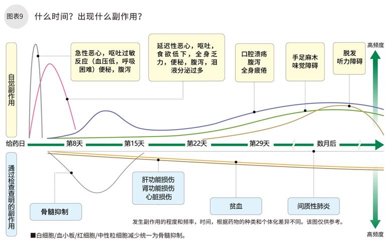 药物疗法的副作用中,有些是可以自己感觉到的,比如恶心,全身乏力等;有些是需要检查才能知道的。比如,骨髓抑制(白细胞/血小板/红细胞/中性粒细胞减少),肝肾功能低下等。治疗恶心,呕吐的药物一直在进步,能够很好的控制恶心,呕吐等副作用。出现副作用的症状和时间根据药物不同有很大的差异,患者应提前知晓主要症状出现的时间点和处置方式以减轻痛苦(图表9~11)。