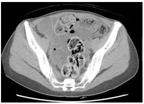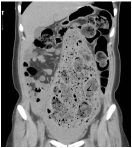 一个月前刚刚生产,与生产部位完全吻合的巨大粪便块。马上进行了腹部CT 检查。