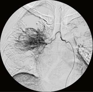 另外,当肺癌组织破坏了较大的支气管动脉,造成患者反复、大量咯血,经过内科药物治疗后不能完全止血,同时又无法耐受或不愿接受外科手术治疗时,就可以经过上述管道将具有堵塞作用的药物注射至破裂出血的支气管动脉,堵塞破口以止血。