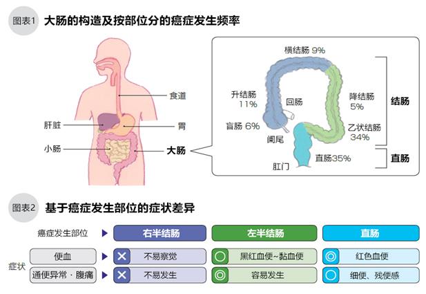 结直肠癌的发病路径有两个,一个是肠内良性腺瘤息肉长大后癌变,另一个是正常粘膜细胞的直接癌变。结直肠癌的70%发生于离肛门最近的乙状结肠和直肠(图1)。结直肠癌进展到一定的大小,就会出现血便、便秘、腹泻、腹痛等症状,早期绝大多数患者无症状。同时,结直肠是一个很长的管状器官,发生癌变的位置不同,症状也可能不同。结肠的右半侧,即肛门的远端发生癌变的癌变,其症状比近端癌变更难发现(图表2)。