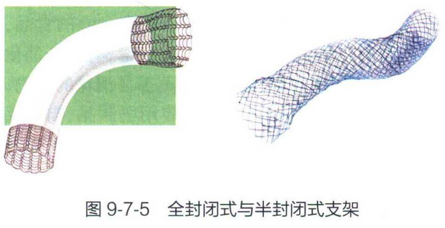 2.SEMS的分类与术式金属支架分为全封闭式和半封闭式(图9-7-5),目前有关两种样式的优劣性并无明确定论。支架的手术步骤分为4部,如图所示,A、通过内镜将导丝穿过梗阻部位;B,将为展开的之间沿内镜内部的轨道和导丝穿过梗阻部位;C、撤去导丝;D、将支架完全展开。