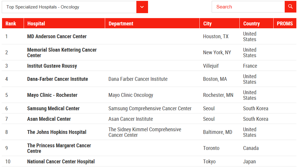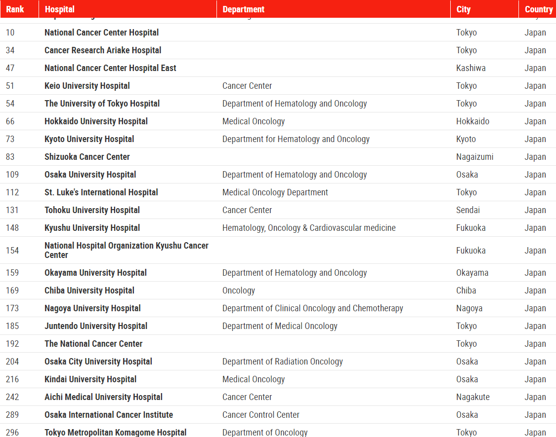 300个最佳专科医院中,日本共有23所医院上榜(无中国医院上榜)。进入前50名的分别为日本国立癌症研究中心中央病院(第10名),日本癌研有明医院(第34名),日本国立癌症研究中心东病院(第47名)。