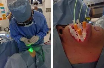 将圆柱形扩散器插入放置在肿瘤中的特殊针导管中,用于治疗复发性口咽癌(左)。光从扩散器发出(右)。