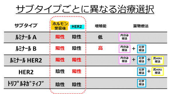 乳腺癌根据是否存在激素受体和HER2过量表达,被分为4种亚型:“luminal型”、“luminalHER2型”、“HER2型”和“三阴性”。此外,luminal类型根据细胞增殖的状态分为“luminal A型”和“luminal B型”。这些分类会影响药物治疗的选择(见下图)。