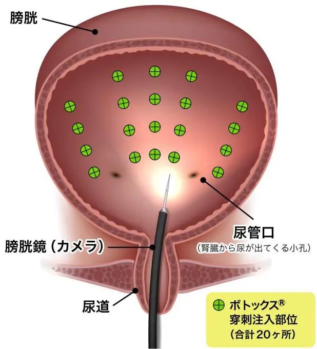 "肉毒杆菌膀胱注射疗法"因其高度的安全性和有效性,从2000年开始就已经在欧美国家普及。将肉毒杆菌毒素注射到膀胱内,使其与膀胱神经结合,产生肌肉松弛作用,从而改善膀胱过度活动症引起的各种症状。该疗法已被全球90多个国家批准用于治疗膀胱过度活动症和其他各种疾病。在日本,它还被用于治疗眼睑和面部痉挛、颈部和四肢姿势异常、腋下多汗症、斜视等疾病。