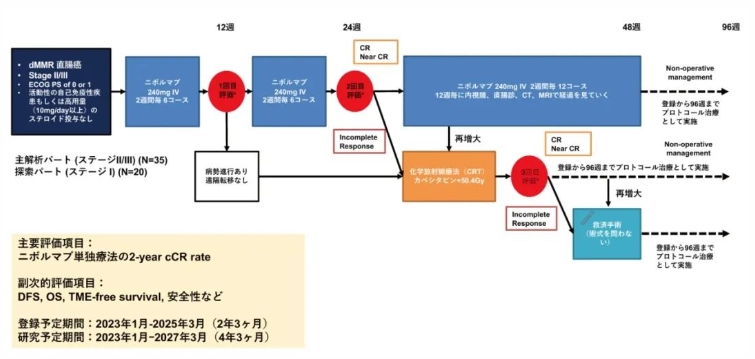 坂东英明教授和他的同事还在进行 VOLTAGE-2 研究,这是一项由研究者发起的临床试验。该试验对 MSI-H局部晚期直肠癌患者在标准治疗前每两周给予纳武单抗 240 mg,持续 12 个周期,达到 cCR 的患者在不手术的情况下继续接受纳武单抗治疗。而对于有肿瘤残留的病例在实施放化疗后根据cCR有无来决定手术(图)。