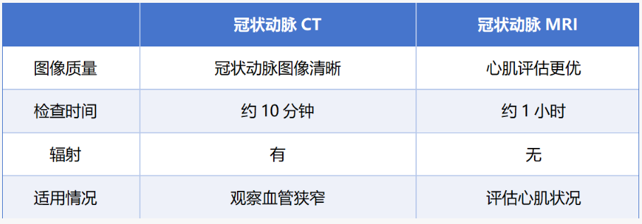 建议:若核心需求是“看血管”,优先选CT;若担心辐射、或需详细查心肌,MRI更合适。