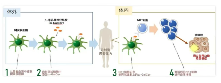 NKT细胞疗法是免疫细胞疗法的一种,是从患者的血液中提取出树突状细胞后,添加α-半乳糖神经酰胺(α-GalCer),再通过静脉点滴回输到患者体内的治疗方法。